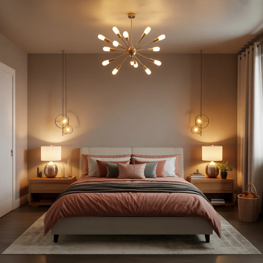 A well-lit space feels both functional and cozy. Consider a combination of a sputnik chandelier for statement lighting and minimalist bedside lamps for reading. Dimmers are also a great addition, allowing you to adjust the brightness according to your needs and mood.