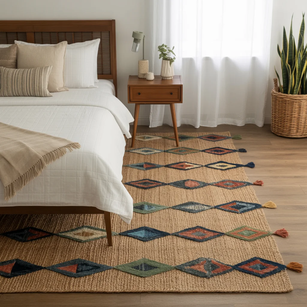 Make sure the rug size complements your furniture, ideally, it should extend beyond the sides of your bed for a balanced look.