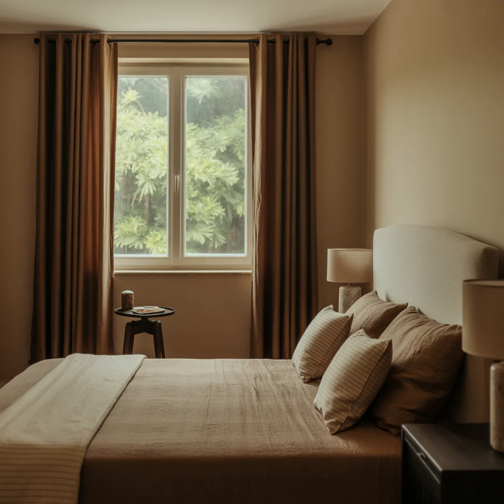 Soft neutrals take center stage in this serene mid-century modern bedroom, creating a calm and balanced atmosphere. The warm taupe walls and linen textures echo simplicity, allowing natural light from the window to cast a gentle glow across the room.