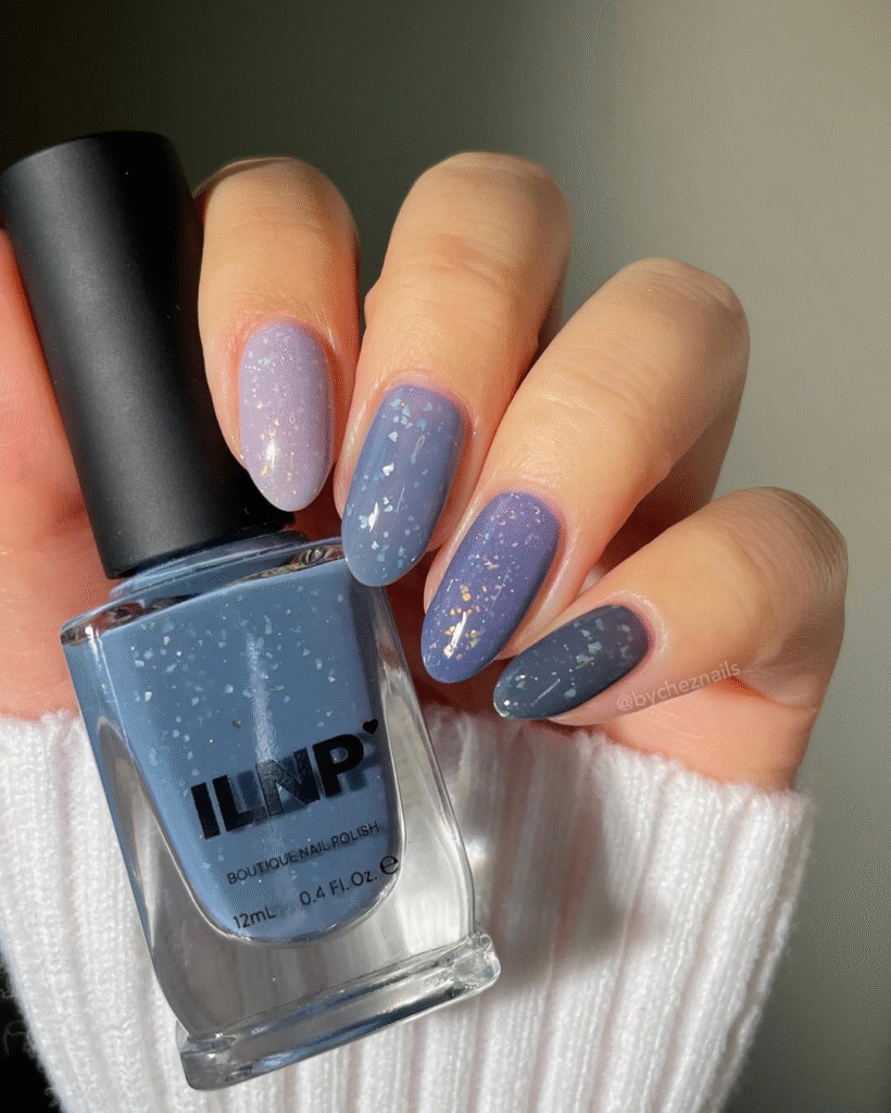 This stunning nail design blends soft pastel blues and purples with a touch of sparkle, making it a perfect choice for the fall season.