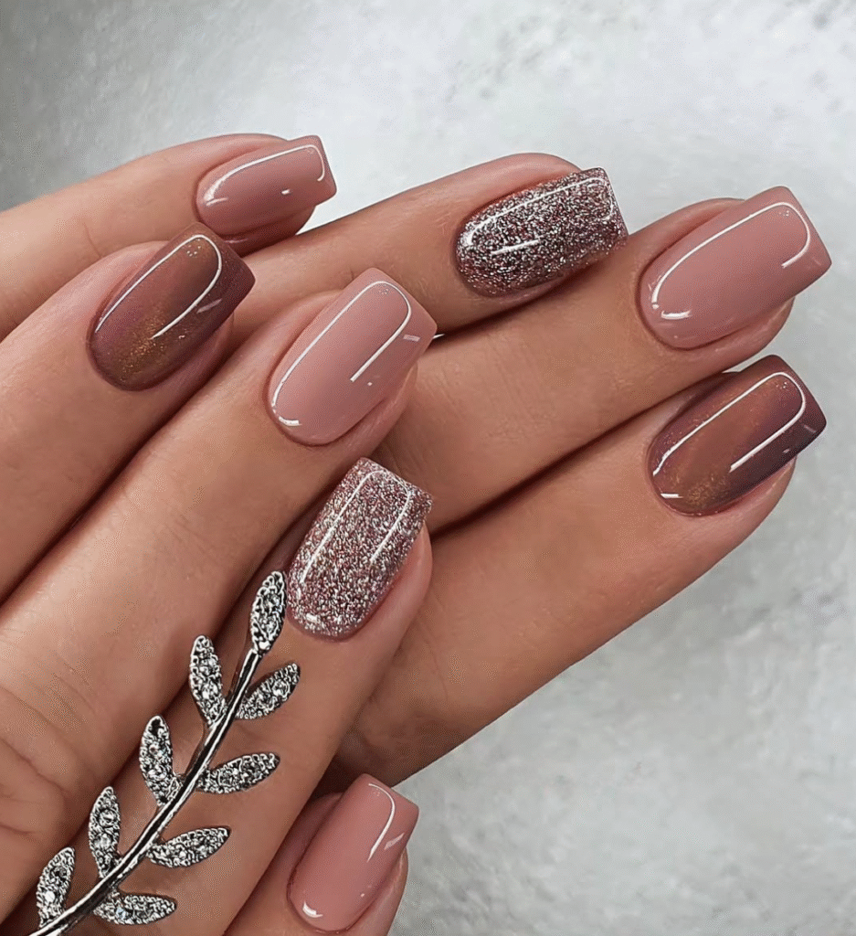 This nail design combines soft, neutral pink tones with a hint of sparkle, creating an elegant and sophisticated look.