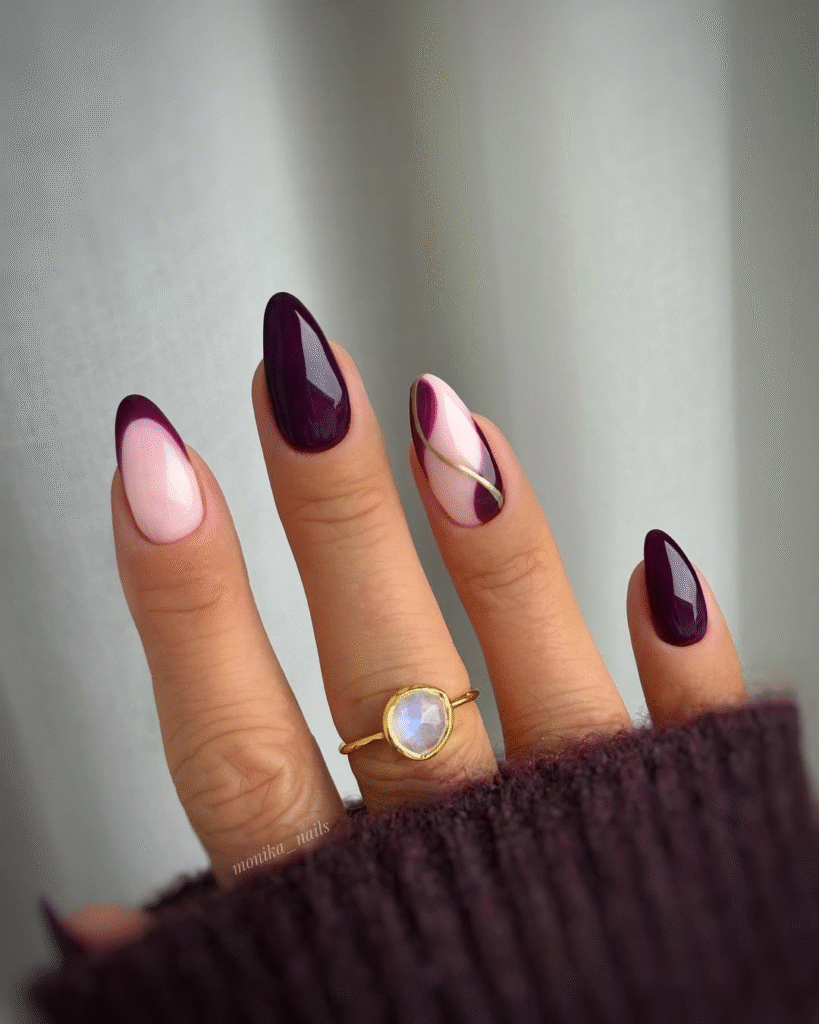 This stunning fall nail design combines deep purple tones with soft pink accents, creating a chic and sophisticated look.