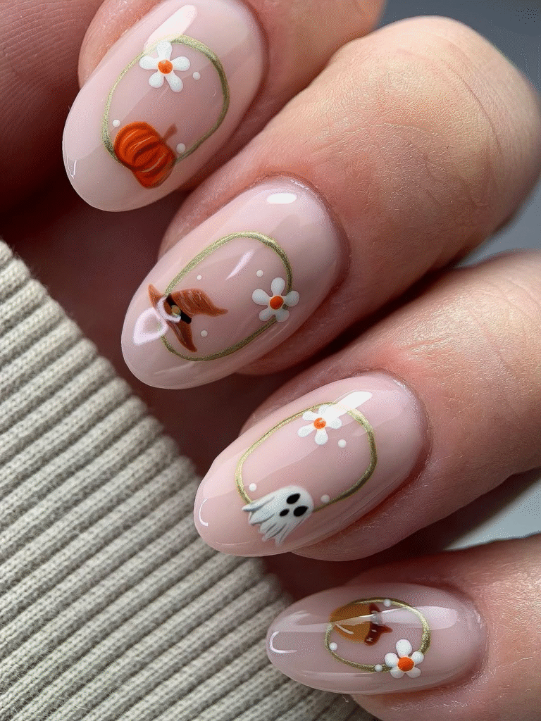 This charming nail design blends the essence of fall with a playful Halloween twist. Each nail features delicate floral accents in white and orange, framed by soft green lines, creating a light and airy look.