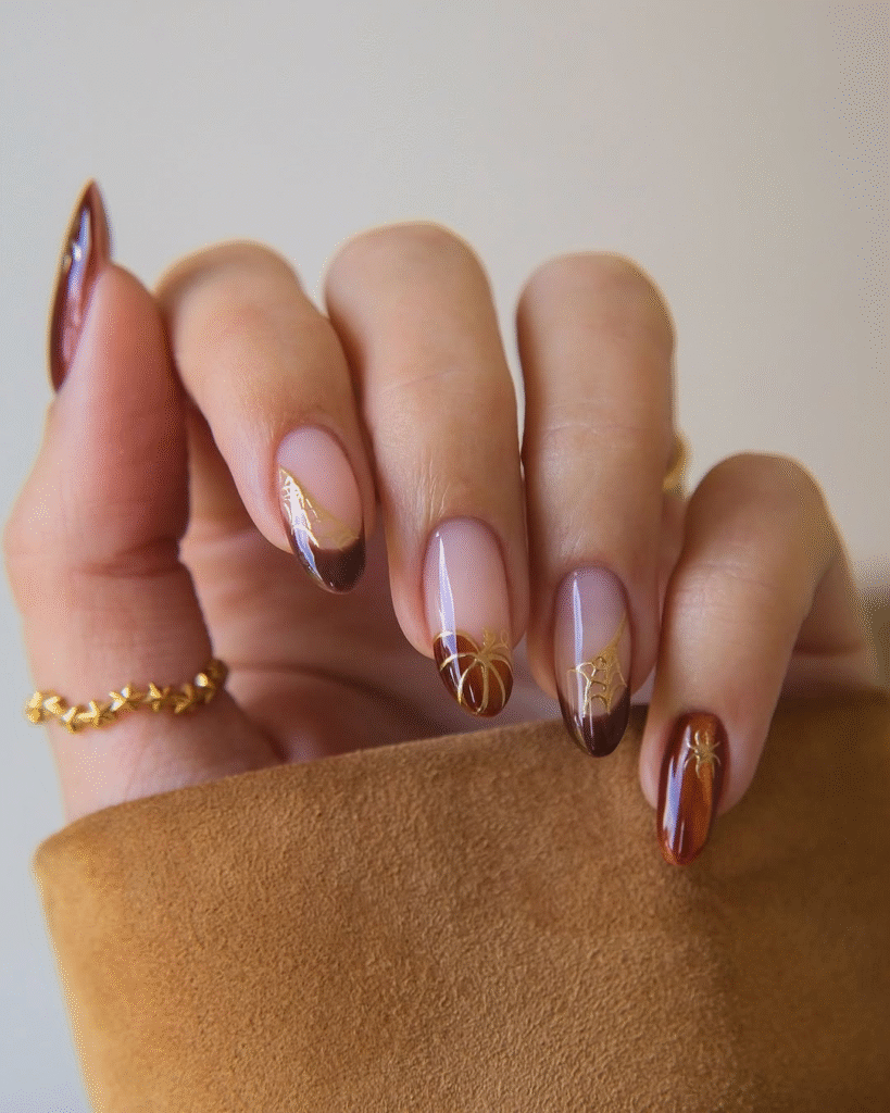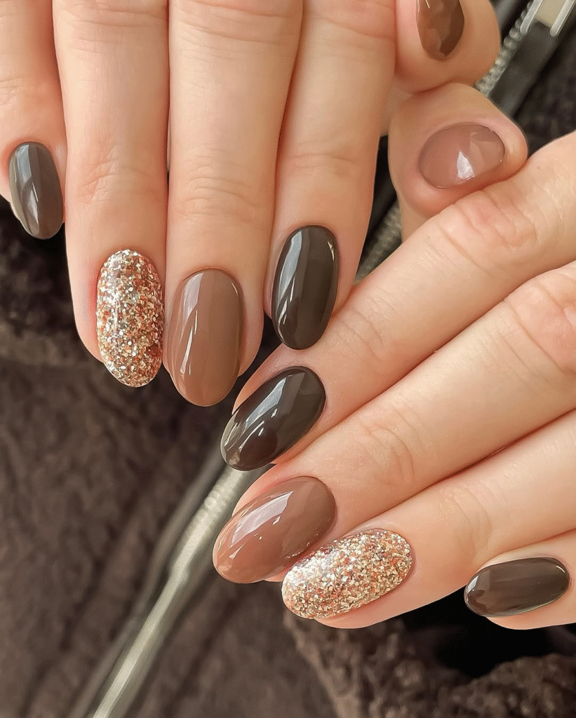 These elegant nails combine rich brown hues with a touch of golden detailing, creating a refined and autumn-inspired look.