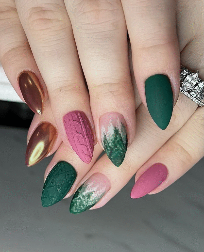 The textured green nails feature a cable-knit design, while the pink nails showcase a subtle, elegant design.