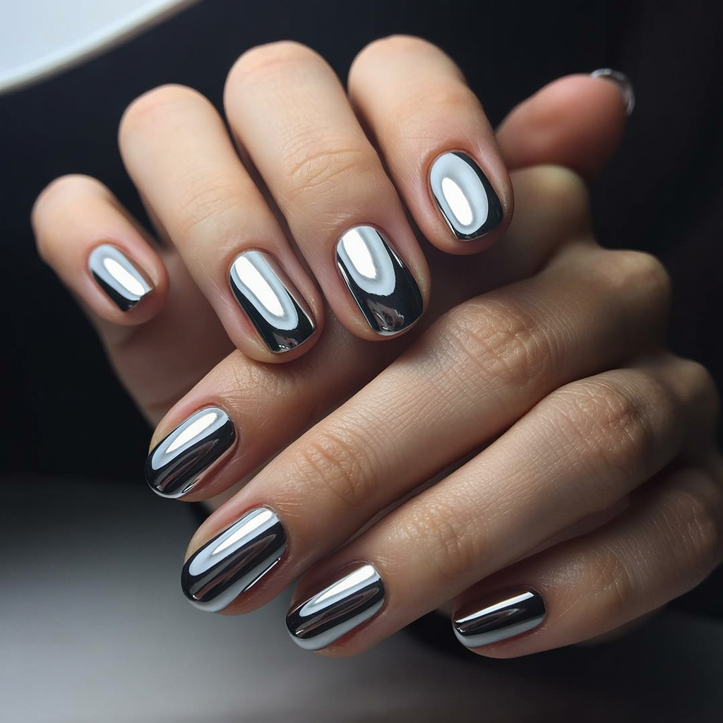 The smooth, oval shape enhances the metallic effect, making the nails look sleek and modern. This minimalist yet daring design is perfect for those who want to add a touch of edginess to their fall style.