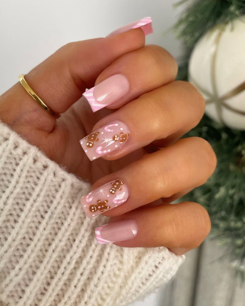 This playful fall design embraces the festive spirit with soft pink and warm brown tones. The delicate French tips, done in a light pink shade, give the nails a fresh, crisp look, while the adorable gingerbread and candy cane illustrations bring a whimsical touch to the design.