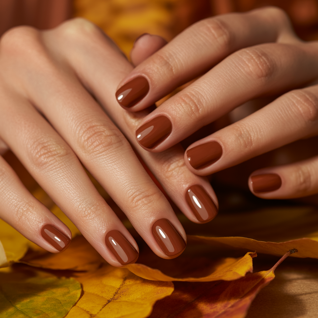 This rich, warm brown shade brings a cozy, autumn-inspired touch to your nails. The glossy finish creates a sleek, polished look, making the deep hue stand out even more.