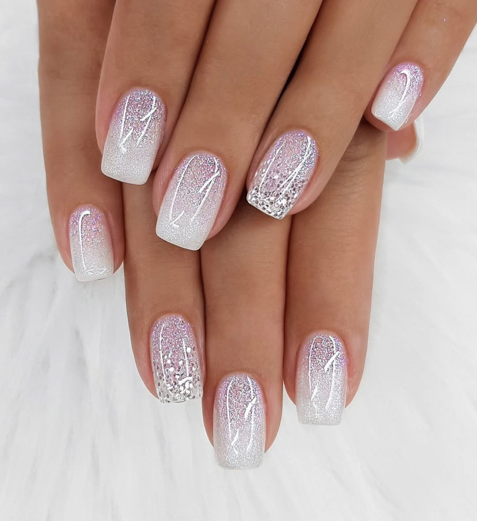 This frosty white and silver design brings a soft, ethereal vibe to your nails. The ombre effect, starting with glittering silver at the tips and fading into a pristine white, adds depth and dimension.