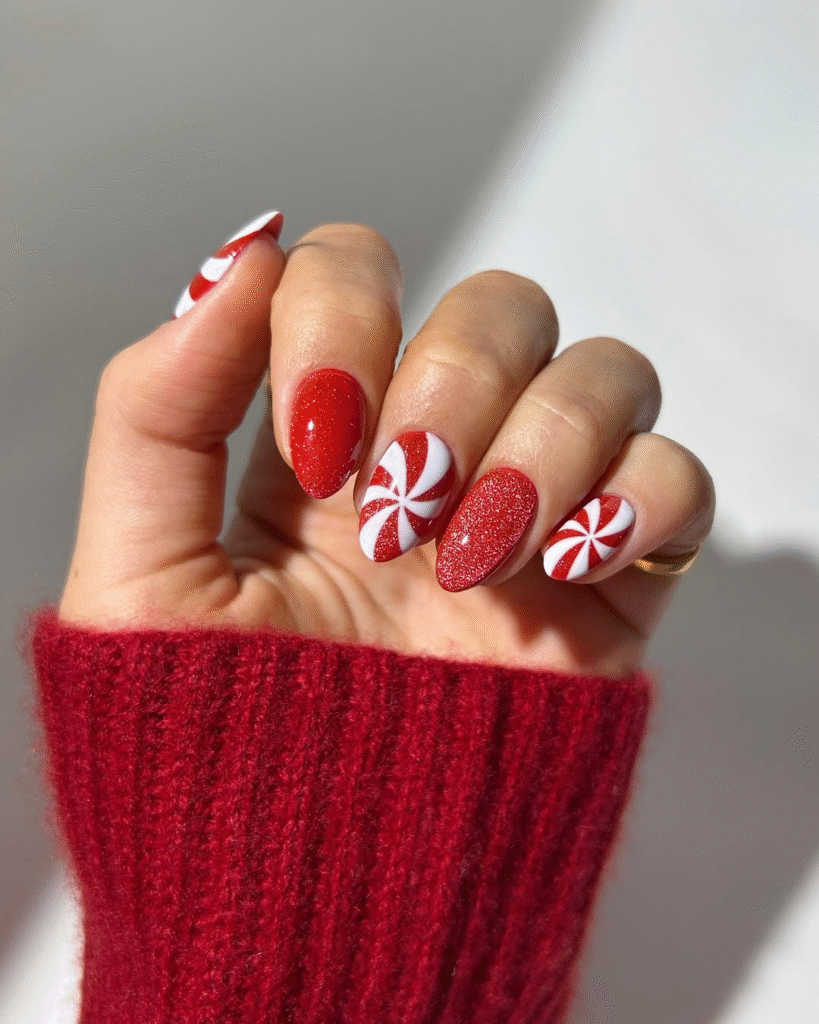 The sparkling red glitter nails add a festive touch, while the white tips with spiral candy details bring a fun, whimsical element.