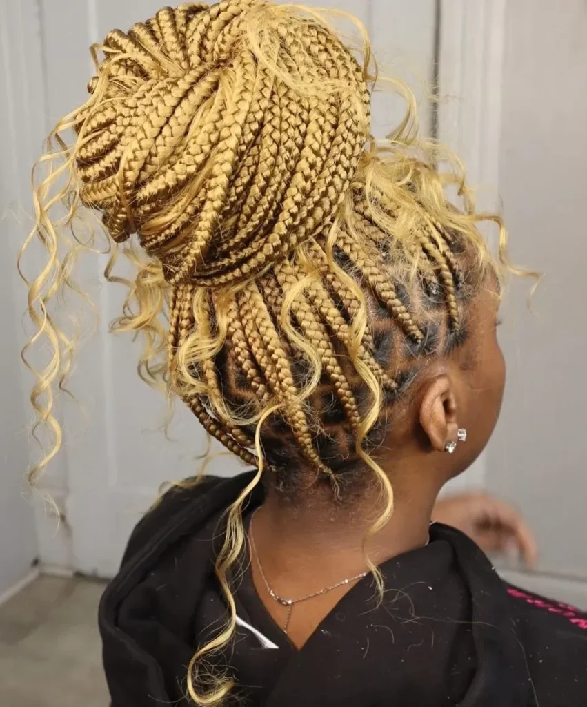 Soft blonde tones add brightness and dimension, making each braid stand out with subtle detail. Loose curled strands bring movement and a gentle, face softening effect.