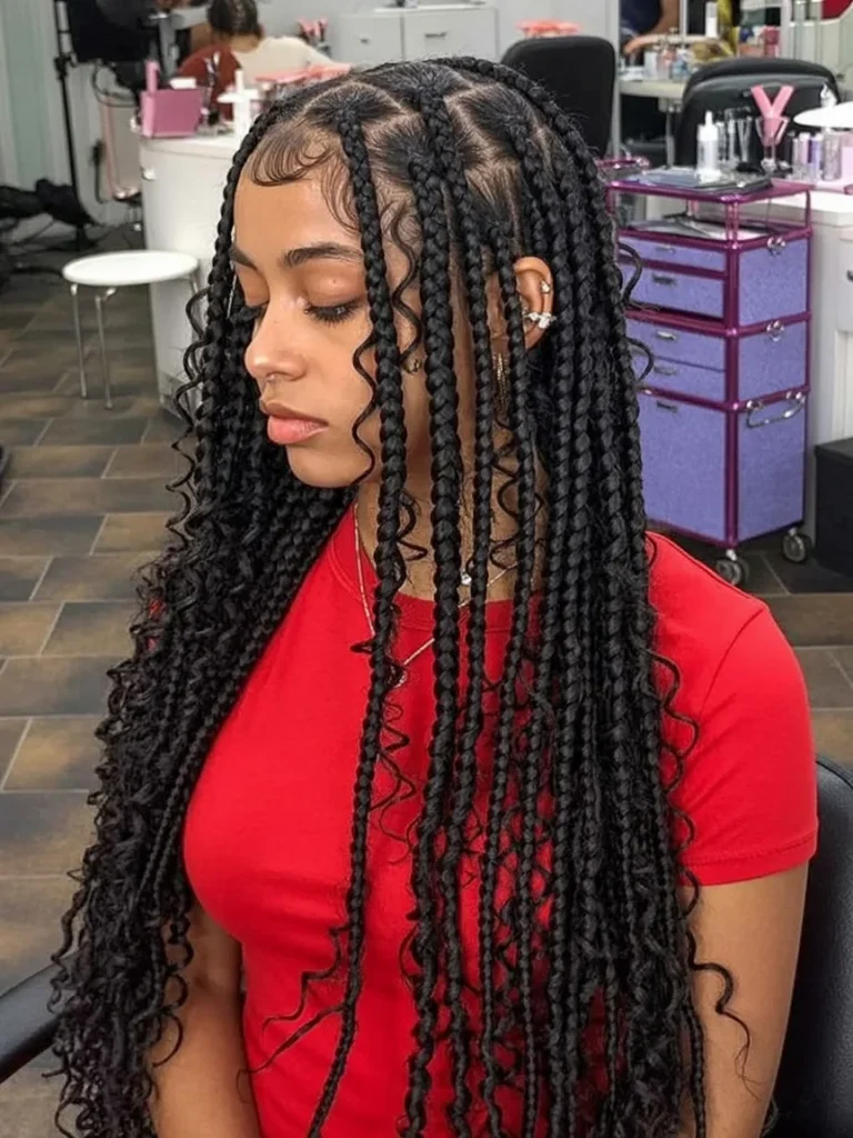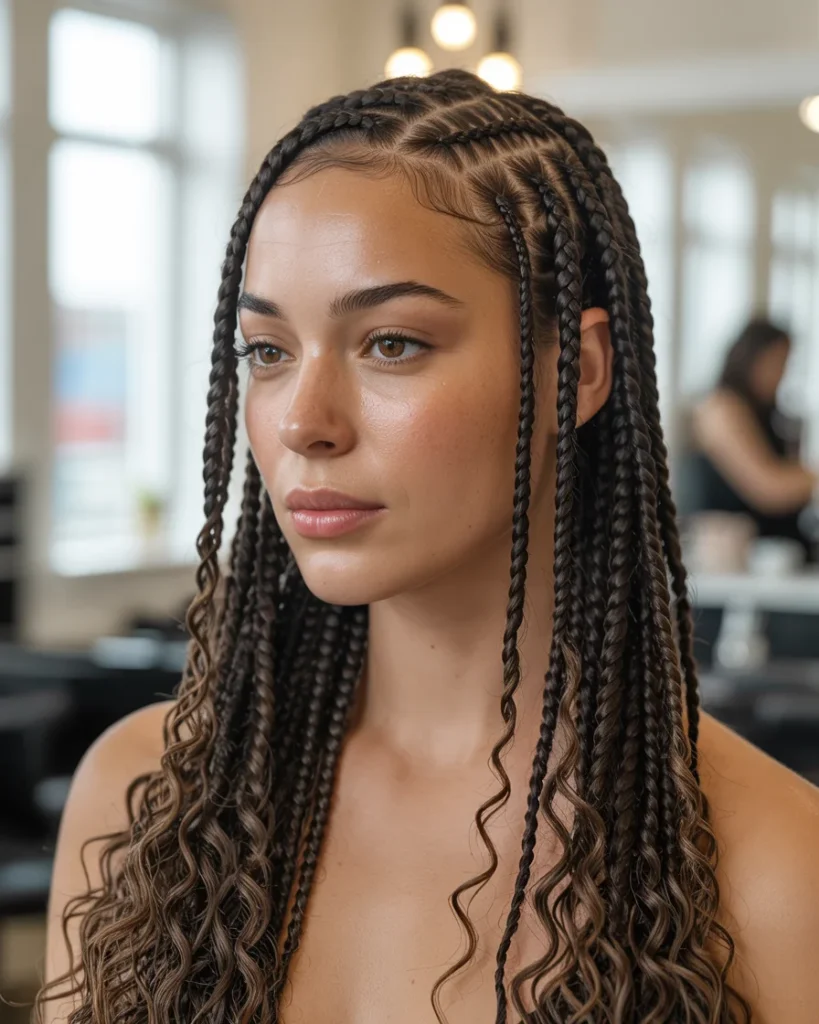 This hairstyle highlights sleek knotless braids paired with soft curls that add movement and depth. Clean parting keeps the scalp comfortable while maintaining a polished look.