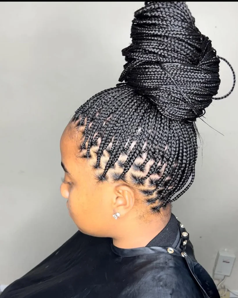 From the front, the braids are neatly directed upward, creating a lifted shape that highlights facial features. Gentle baby hairs are styled with care, adding a smooth and graceful finish.