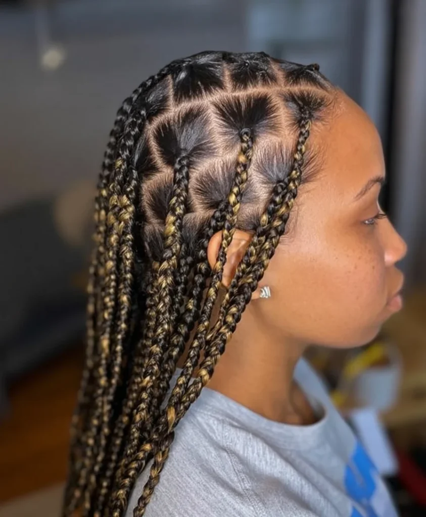 This hairstyle highlights sleek knotless braids with clean sections that create a sharp and stylish pattern. The smooth roots show careful styling while keeping the scalp relaxed and comfortable.