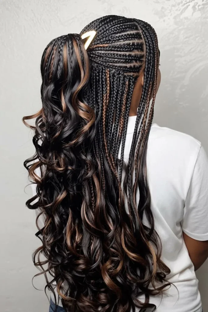 Loose curls flow naturally from the braids, adding a light and playful feel to the overall style. The mix of texture gives the hair depth without looking heavy.