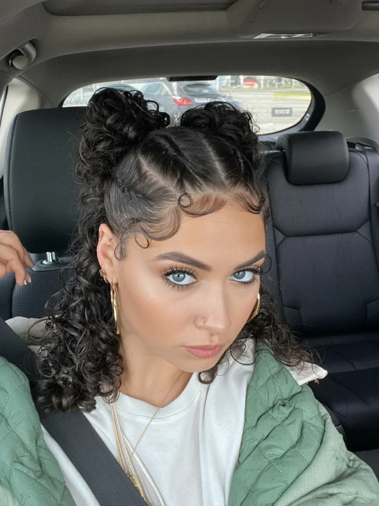This hairstyle features playful curly space buns paired with neat, defined parting at the front. The style feels light on the scalp while keeping the look structured and clean.