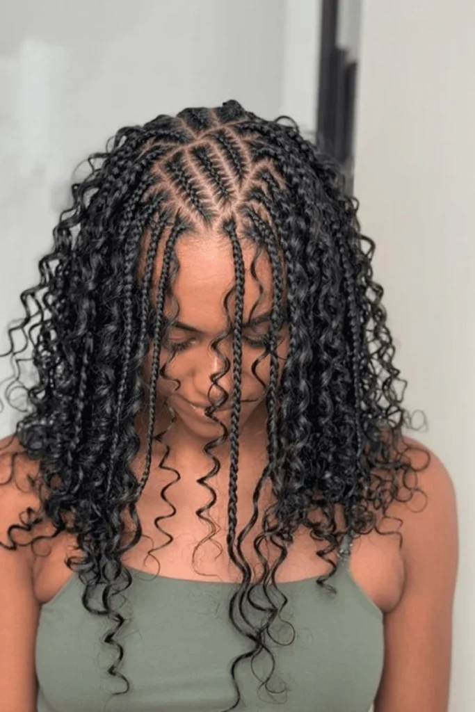 Loose curls blended through the braids bring a natural, flowing finish that frames the face gently. Styled edges enhance facial features and add a refined touch.