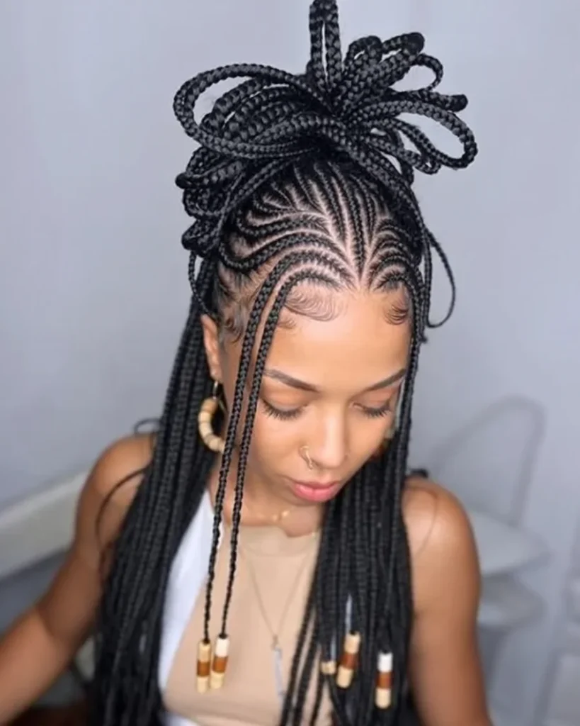 The elevated bun offers a polished finish while keeping the braids neatly secured. This makes the look practical for busy days and long wear.