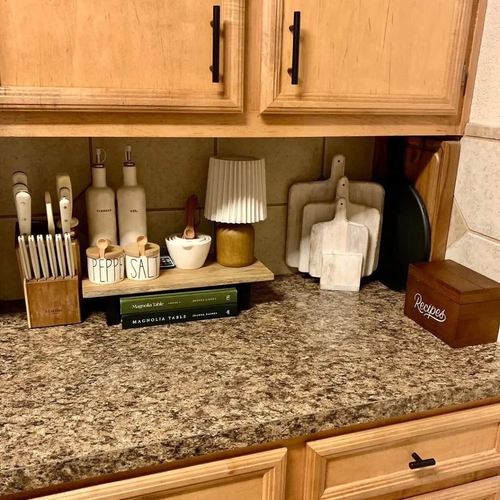 On the right, a mix of cutting boards leans together, creating balance and giving the space a layered look. A recipe box finishes the corner with a personal touch. Every piece works together, turning this spot into a warm and easygoing area for everyday cooking.