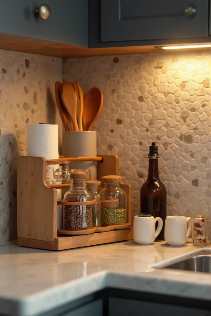 Soft under-cabinet lighting warms the stone backsplash, giving the corner a calm, inviting glow. Every piece feels useful yet thoughtfully placed, creating a cozy little workstation that makes cooking feel easier and more enjoyable.