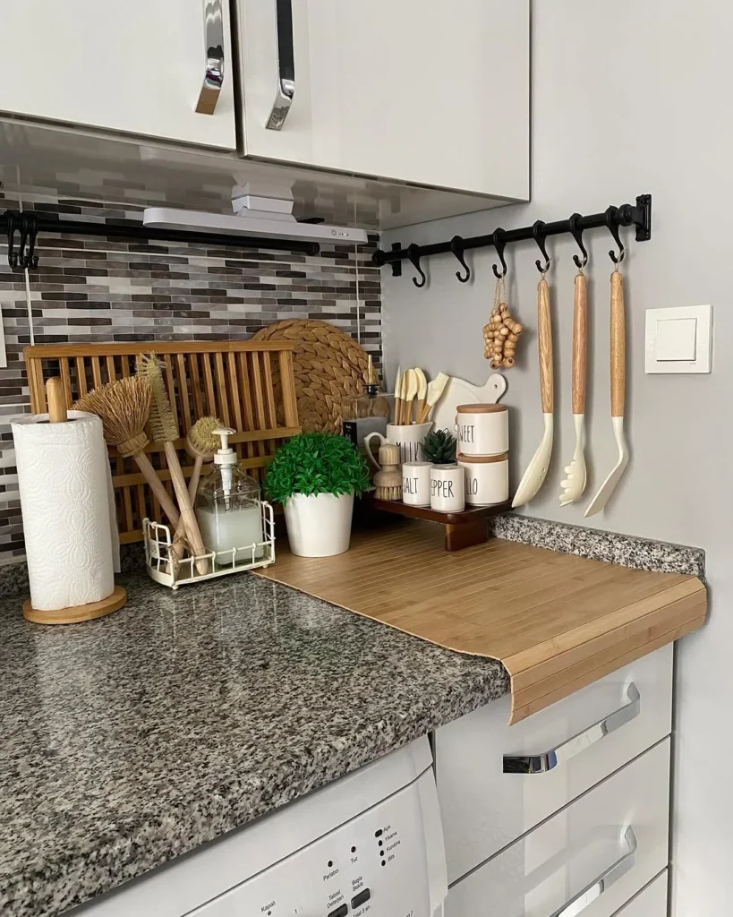 A functional neutral-themed utility corner like this brings order and warmth to a busy kitchen. Thoughtfully placed hooks hold everyday utensils, keeping them within reach while freeing up drawer space.