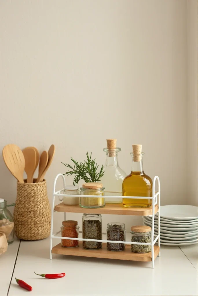 A minimal spice and oil rack setup like this brings calm order to a kitchen corner. Glass jars with cork lids line the shelves, giving the space a warm, natural feel while keeping everyday spices easy to reach.