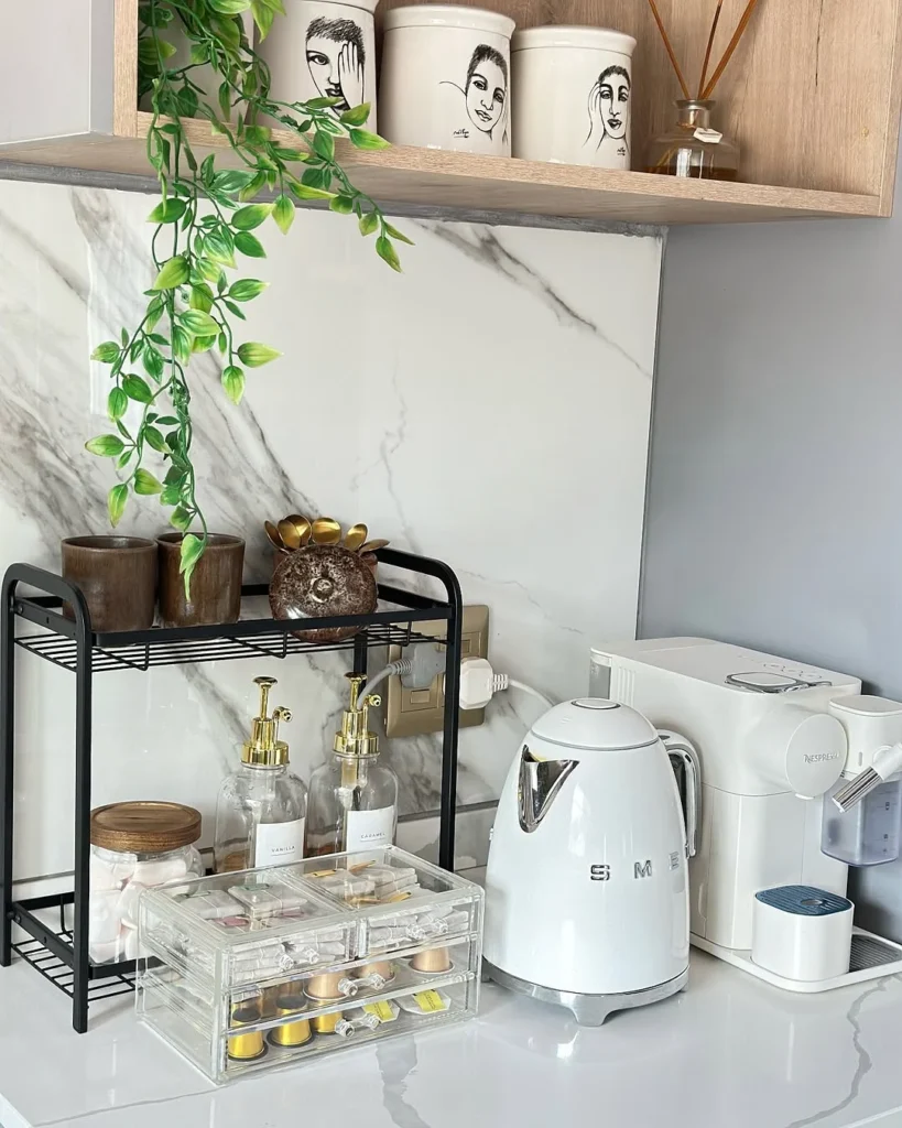 A modern coffee and tea corner like this brings comfort and calm to the countertop. A white SMEG kettle and espresso machine set the tone with their clean, rounded shapes. Nearby, a clear capsule organizer keeps everything easy to reach while adding a neat, polished touch.