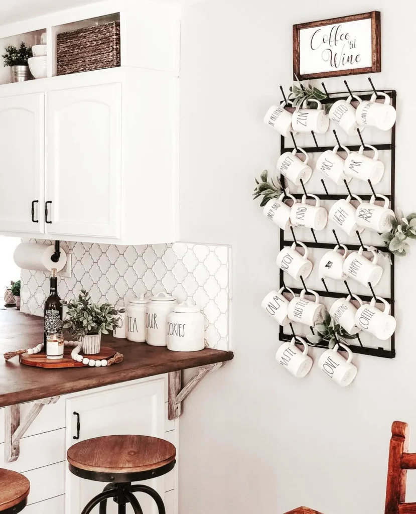 A farmhouse mug wall and wooden counter corner like this brings warmth and personality into the kitchen. A large metal rack filled with labeled mugs turns an empty wall into a charming display that feels both homey and useful.