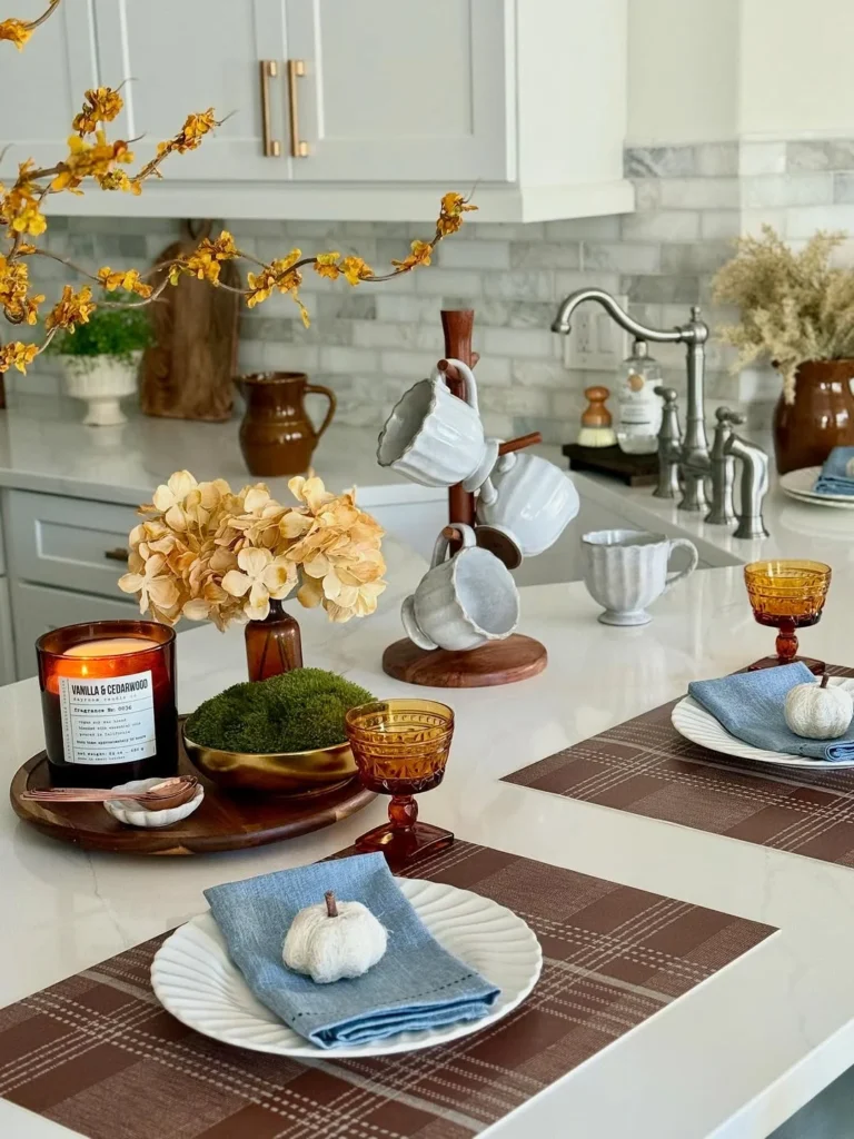 A warm autumn coffee corner like this brings a soft seasonal charm to the kitchen. Amber glasses on plaid placemats set a cozy tone, while the small white pumpkins add a playful fall touch.