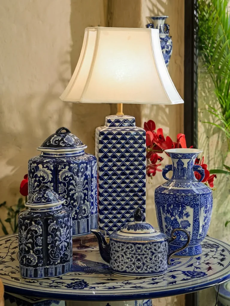 A blue-and-white accent corner like this brings timeless charm to any kitchen counter. A tall ceramic lamp anchors the arrangement, casting a soft glow that highlights the detailed patterns on each piece.