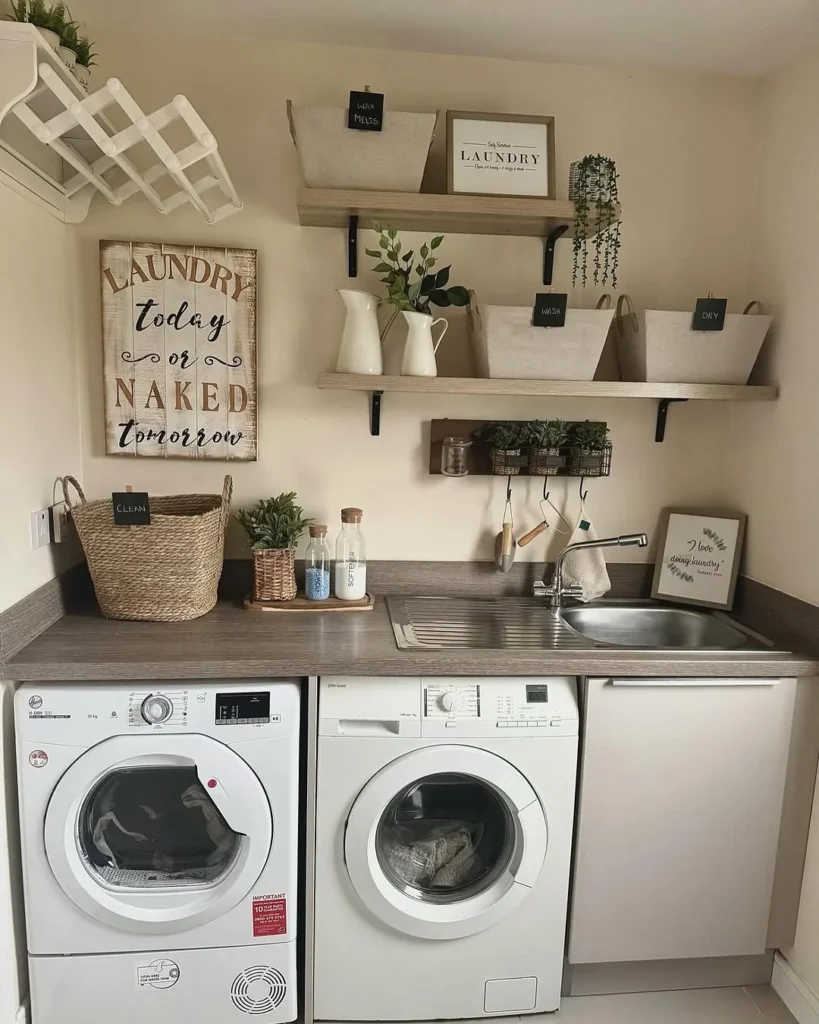 A laundry-inspired corner like this brings order and calm into a busy home. Storage baskets on the shelves keep supplies tucked away while still looking tidy, each labeled to make daily routines feel easier.