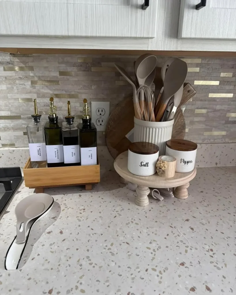An everyday cooking essentials corner like this brings both order and comfort to a busy kitchen. Bottles of oil and vinegar sit neatly in a wooden holder, giving the space a clean, organized look and keeping ingredients close for quick cooking.