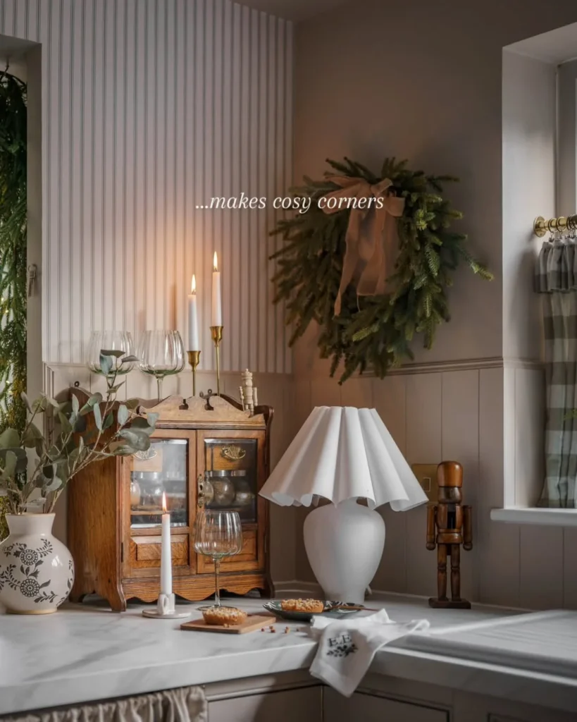 A wreath on the wall introduces a seasonal hint, while the wooden nutcracker brings a playful, nostalgic note. Small treats on plates make the corner feel lived in and inviting. With its quiet blend of light, greenery, and vintage elements, this cosy corner transforms the kitchen into a comforting retreat.