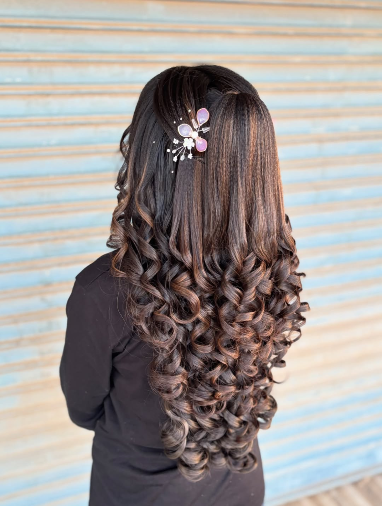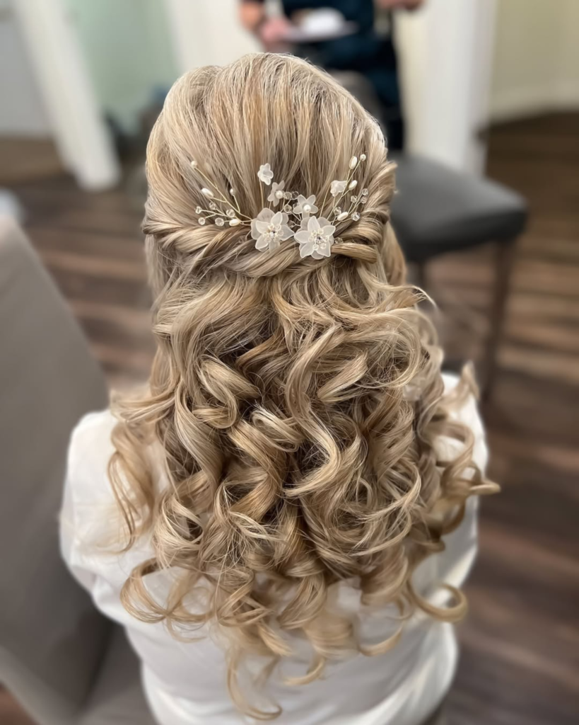 This romantic hairstyle features soft, voluminous curls that cascade down, with a half-up section delicately pinned back using a beautiful floral hair accessory. The intricate detail of the accessory adds an elegant touch to the curls, creating a chic and feminine look.
