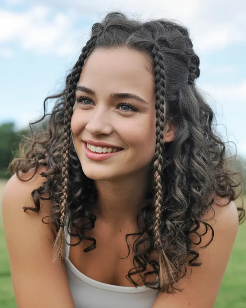 For a fun, youthful twist on the classic half up look, try incorporating two small braids on either side of your head before securing them into a half up style. This style adds texture and interest to your curls, giving you a unique and playful look.