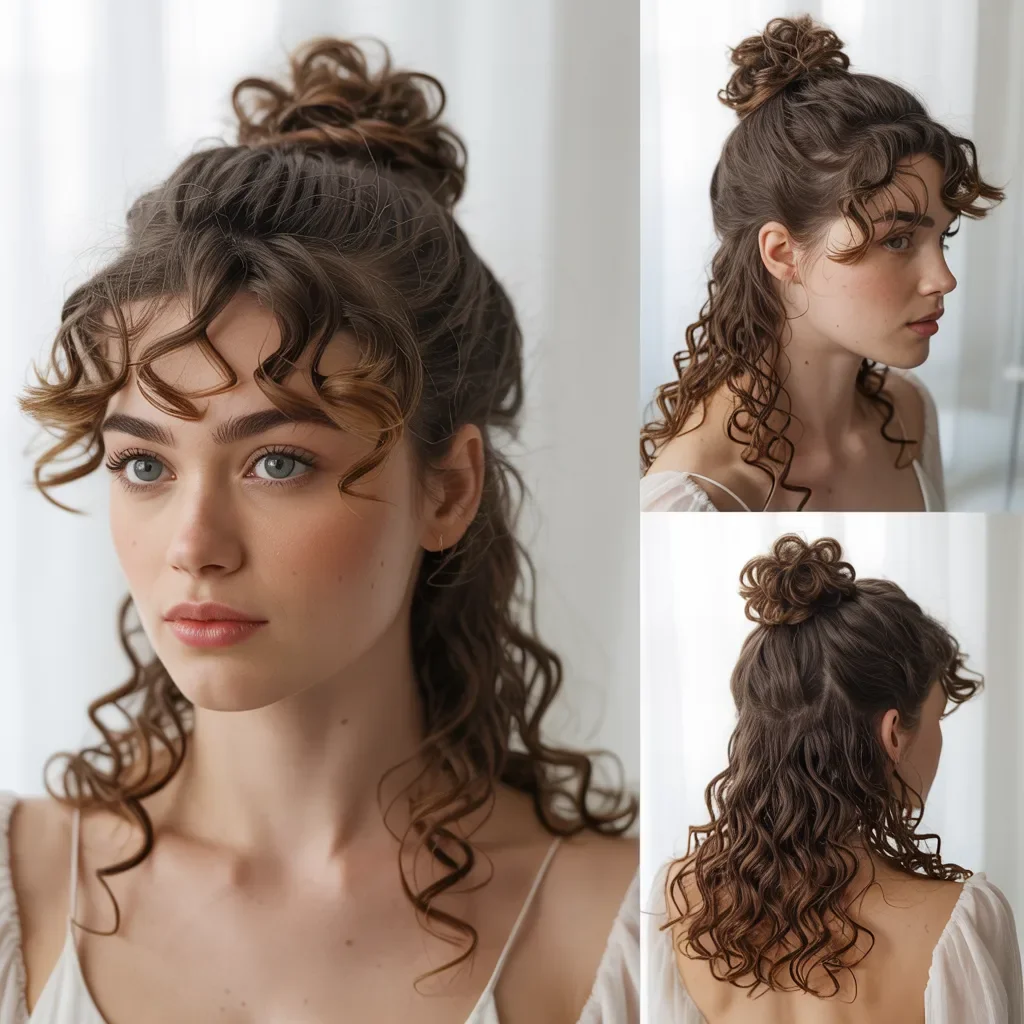 This style combines the elegance of a top knot with the carefree beauty of loose curls. Gather the top section of your curls into a high knot and leave the rest of your curls loose for a chic, fun look. This style adds height and volume, making it perfect for those with shorter or medium-length curly hair.