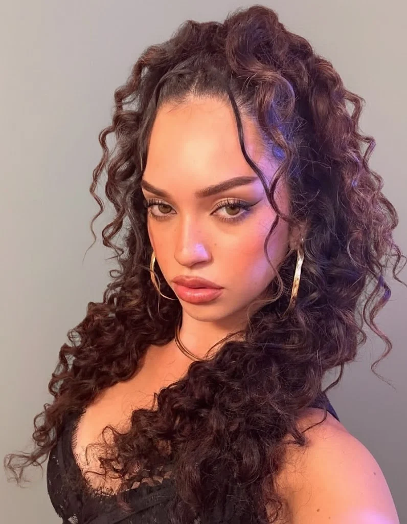 This style features a bold, voluminous half-up look where the top section of curls is pulled back, leaving the rest of the hair loose and flowing. The defined curls add plenty of texture, while the natural waves enhance the overall volume. The style is complemented by bold accessories, like large hoop earrings, for a confident, fierce vibe.