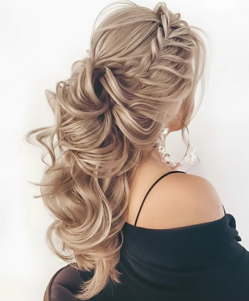 This stunning hairstyle combines a loose, messy fishtail braid with bouncy, voluminous curls for a chic yet relaxed look. The braid adds a touch of sophistication, while the flowing curls create an effortlessly glamorous feel. Paired with large statement earrings, this style is perfect for showcasing both elegance and a bit of playfulness.