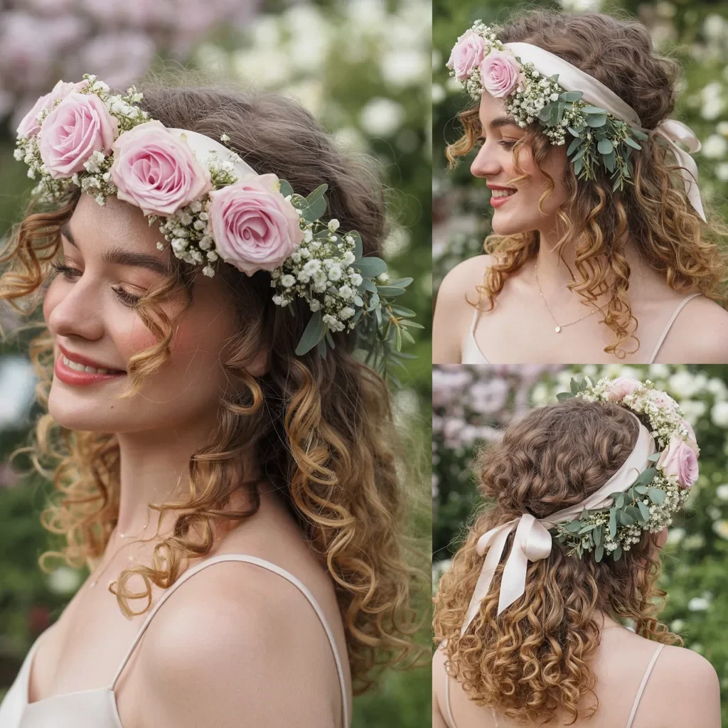 If you’re looking for a more romantic and whimsical style, try adding a flower crown to your curly half up half down hairstyle. The addition of fresh or faux flowers gives this style a soft and dreamy vibe, perfect for weddings or garden parties.