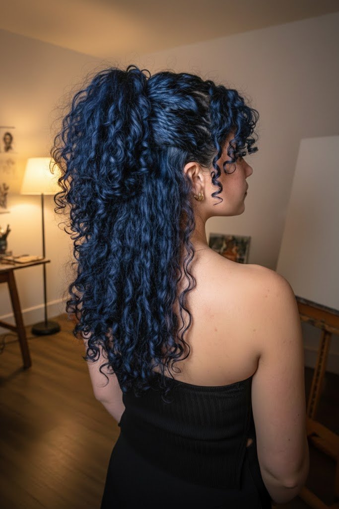 This eye-catching hairstyle features voluminous, defined curls styled in a half-up ponytail with soft, natural curls left to flow. The vibrant blue color adds a bold and creative touch to the look, making it stand out. The curls around the face frame the features beautifully, while the loose ponytail adds an effortless yet chic vibe.