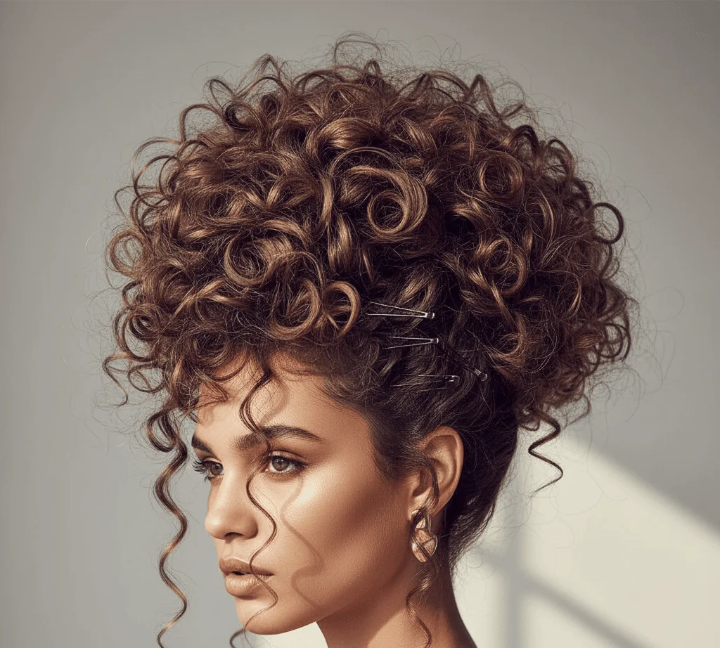 The voluminous curly updo is a showstopper that blends glamour with effortless confidence. Each curl is pinned with precision to create height and body, turning natural texture into an art form.