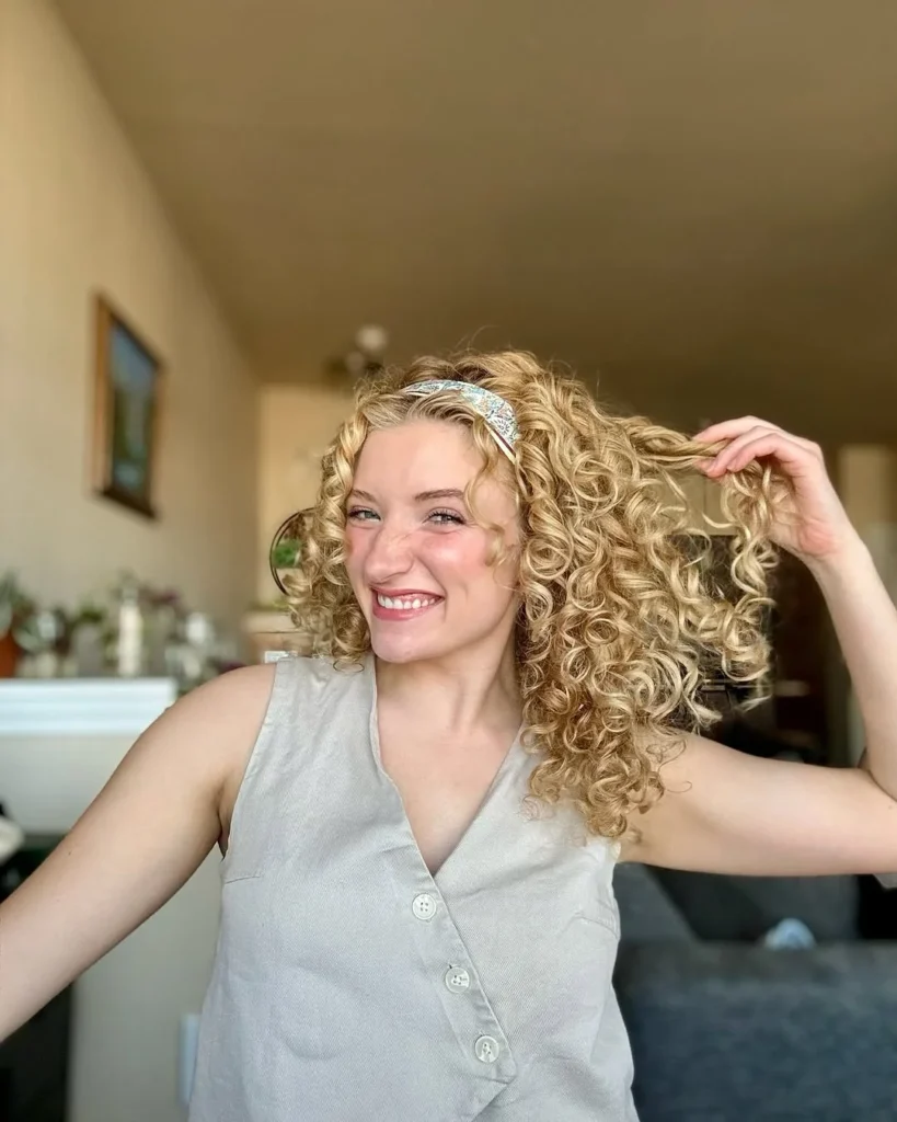 Curly hair paired with a headband always creates an effortless, cheerful look. The soft, defined curls bring natural bounce and texture, while the headband adds a playful and vintage-inspired touch.
