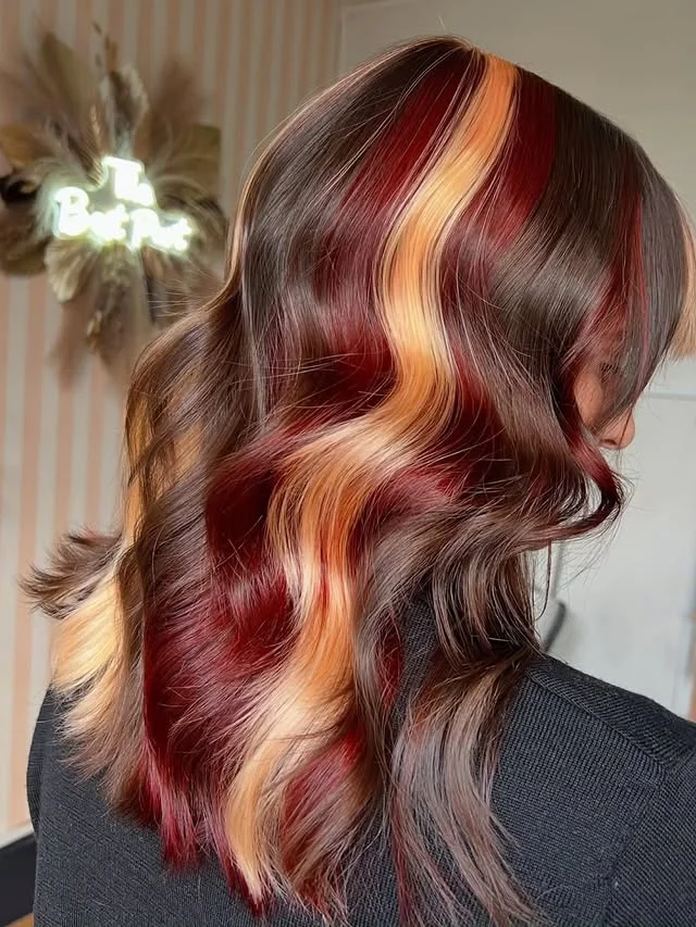 Rich brunette tones create a smooth base for this artistic color blend, while bold red and warm blonde ribbons add striking contrast. Flowing waves help the colors melt into each other, giving the hair a soft and fluid appearance.