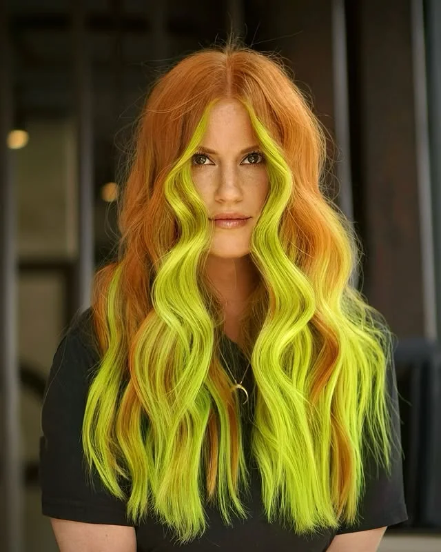 Bold contrast takes center stage in this striking hair color combination. Warm copper tones at the roots create a rich base, while neon green panels flow through the lengths for a daring and artistic finish.