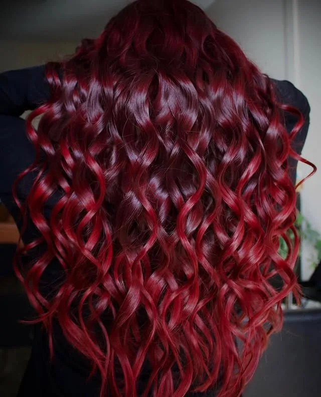 Bold red tones transform this long, wavy hairstyle into a striking statement. Deep cherry and wine shades blend seamlessly through the length, creating rich dimension and intense shine.
