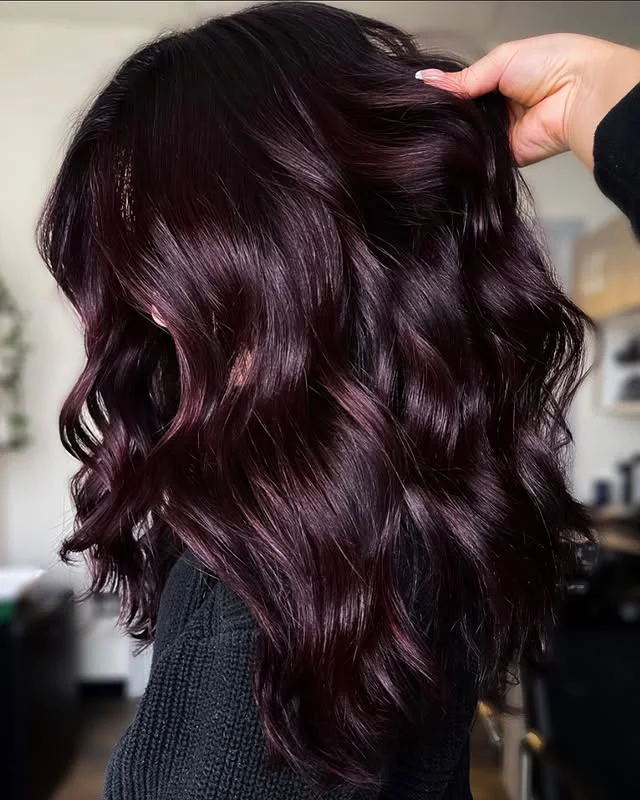 Deep, moody tones define this rich hair color with a glossy, elegant finish. A dark brunette base blends seamlessly with subtle plum and wine undertones, creating depth that feels refined and modern.