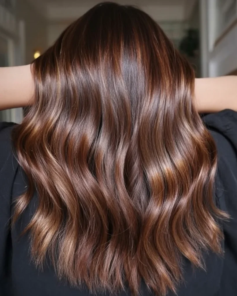 Smooth waves and rich tones define this elegant brunette hair color. A deep brown base is enhanced with soft chestnut highlights that flow naturally through the length. Light reflects gently across the waves, giving the hair a healthy and glossy appearance.