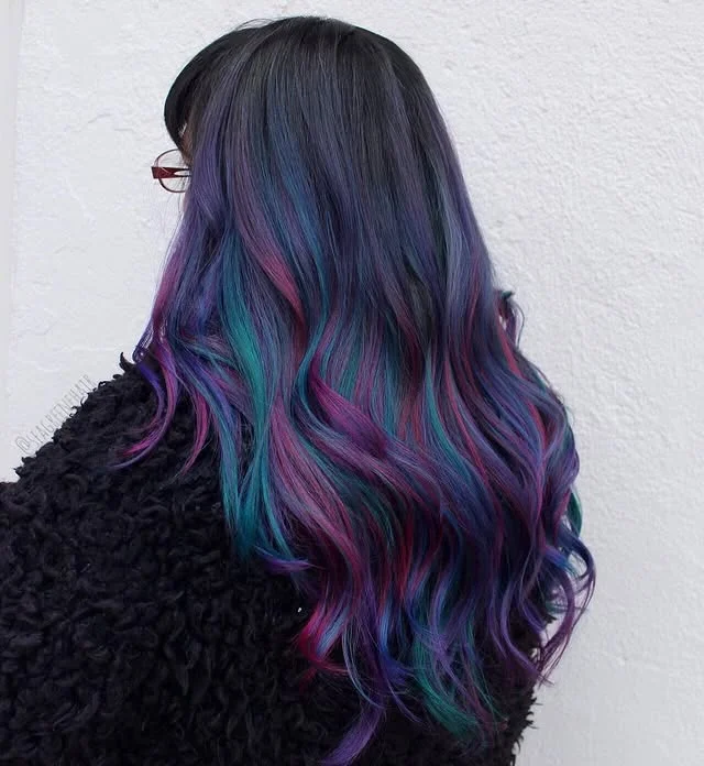 Dark roots flow smoothly into a stunning mix of jewel inspired shades, creating a bold yet balanced hair color. Deep navy tones form the base, while teal, violet, and soft magenta accents weave through the length with effortless blend.