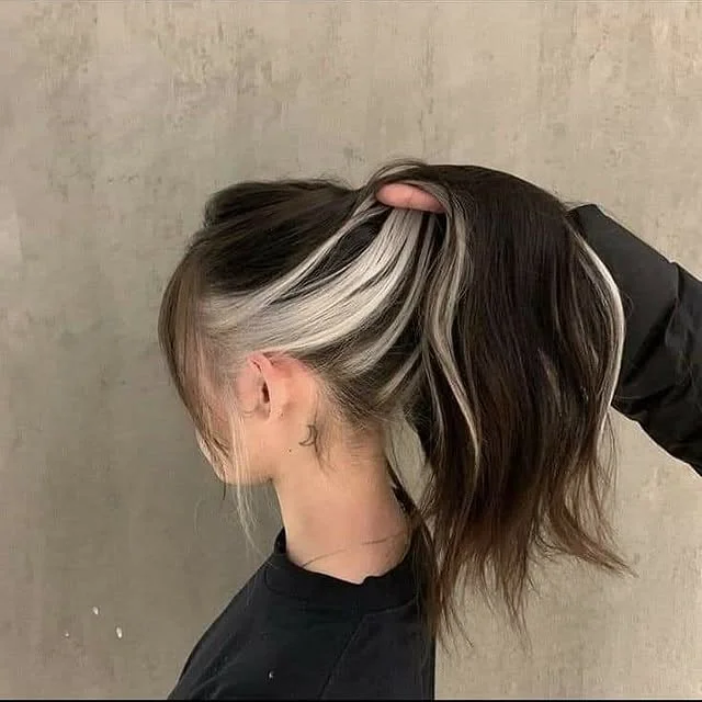 This high contrast ponytail showcases a bold mix of deep brunette and cool silver streaks that instantly grab attention. Dark roots keep the style grounded, while the lighter panels add sharp definition and visual interest.