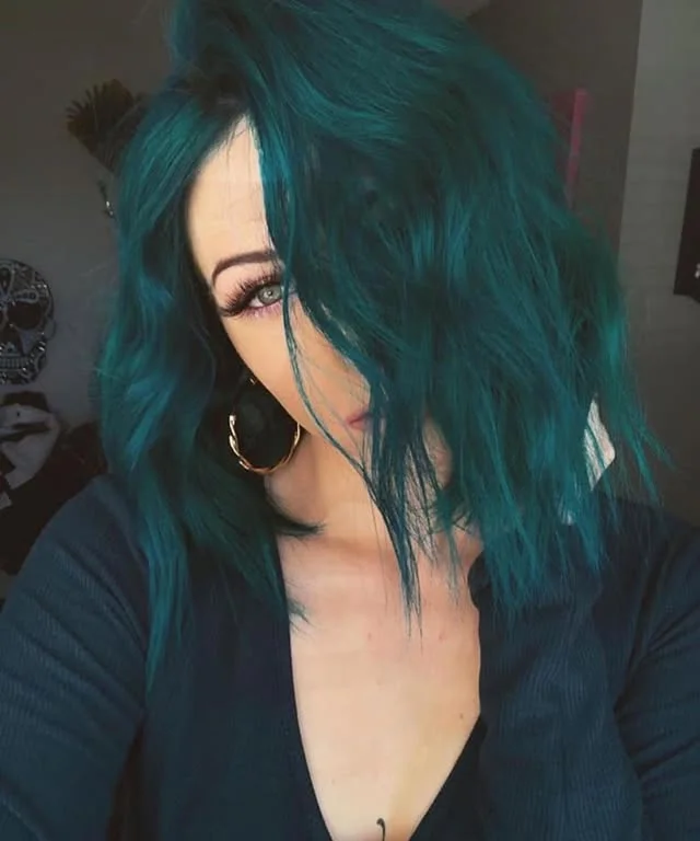 Light catches the cool blue green shades beautifully, giving the hair a rich and dimensional finish. A slightly tousled style keeps the look relaxed and modern rather than overly styled.